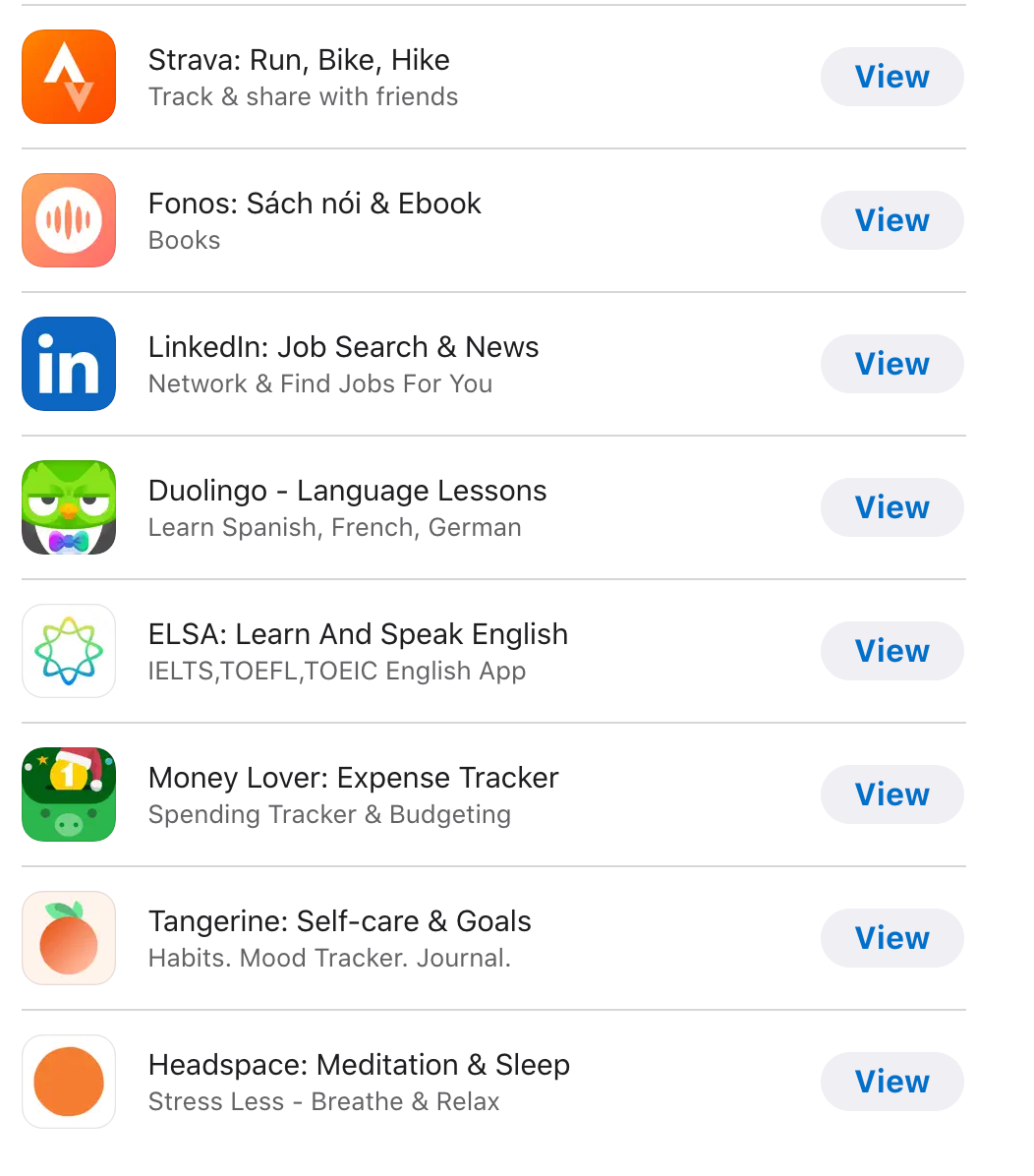 Xu hướng tập trung đầu tư cho bản thân và phát triển kỹ năng, sức khoẻ tinh thần đang được rất nhiều người dùng Apple quan tâm. Bởi vậy đứng cùng bảng xếp hạng với sách nói Fonos, hạng mục Ứng dụng phát triển Thân - Tâm - Trí bao gồm: Doulingo, Elsa, Tangerine: Self-care & Goals, Headspace, Strava...
