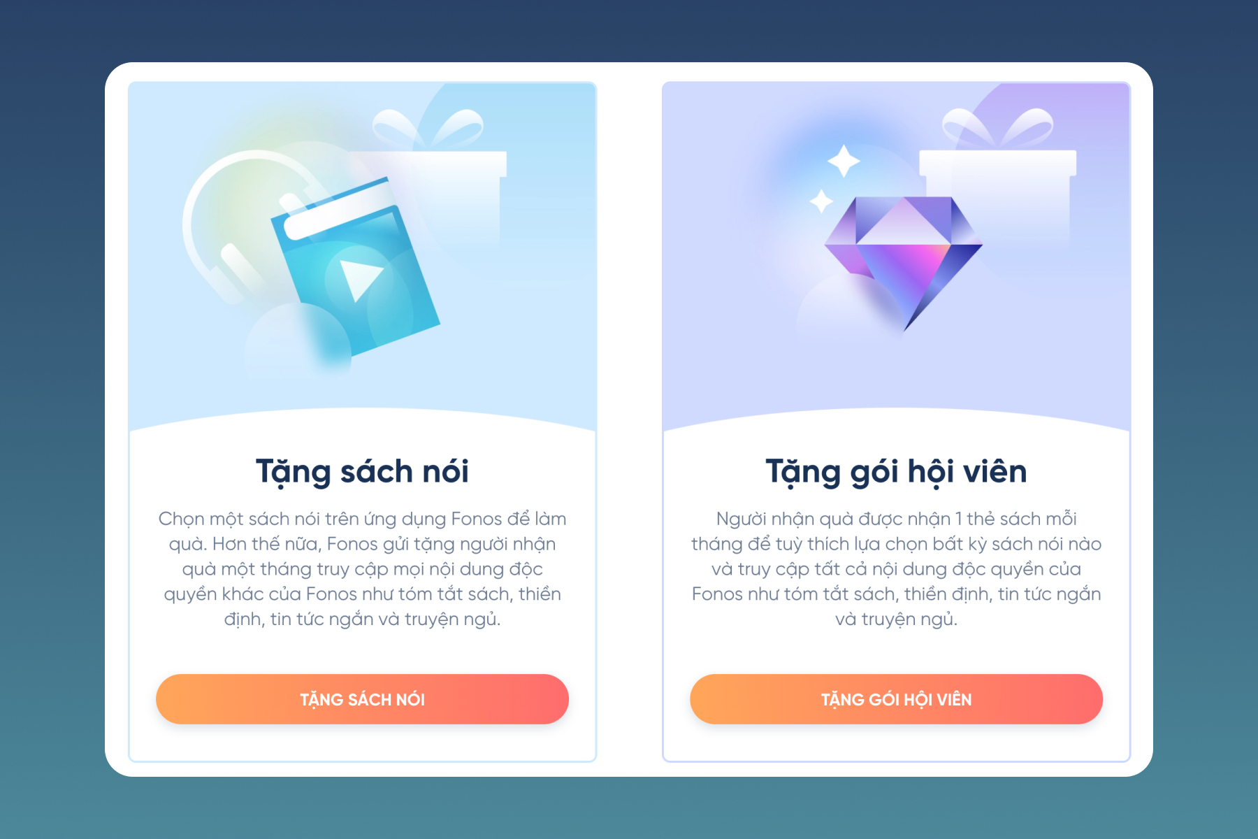 Bạn chỉ cần truy cập website https://fonos.vn/qua-tang, sau đó chọn món quà ưng ý (Gói Hội viên hoặc Sách nói) rồi gửi đến người muốn tặng. Người nhận cũng sẽ thấy món quà ngay lập tức cùng hướng dẫn cài đặt và sử dụng.