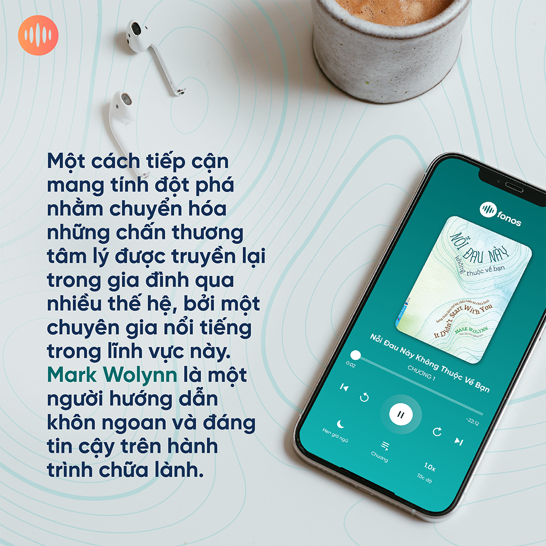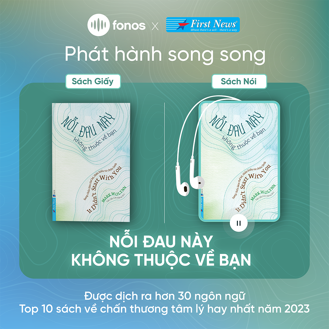 Đánh dấu bước hợp tác đầu tiên trong việc ra mắt sách nói First News và Fonos, cuốn sách “Nỗi đau này không thuộc về bạn” (tác giả: Nó không bắt đầu với bạn) là công trình nghiên cứu đầu tiên, khảo sát, phân tích một cách chi tiết, sáng tỏ, thực tế và hữu ích nhất về công việc hiểu biết và chữa lành những chấn thương liên hệ này. Qua đó, nó tập trung xác định, xử lý chữa lành và chữa lành những nỗi đau vô thức, giúp bạn phá vỡ vòng tuần hoàn, lấy lại cuộc đời chân chính về mình.